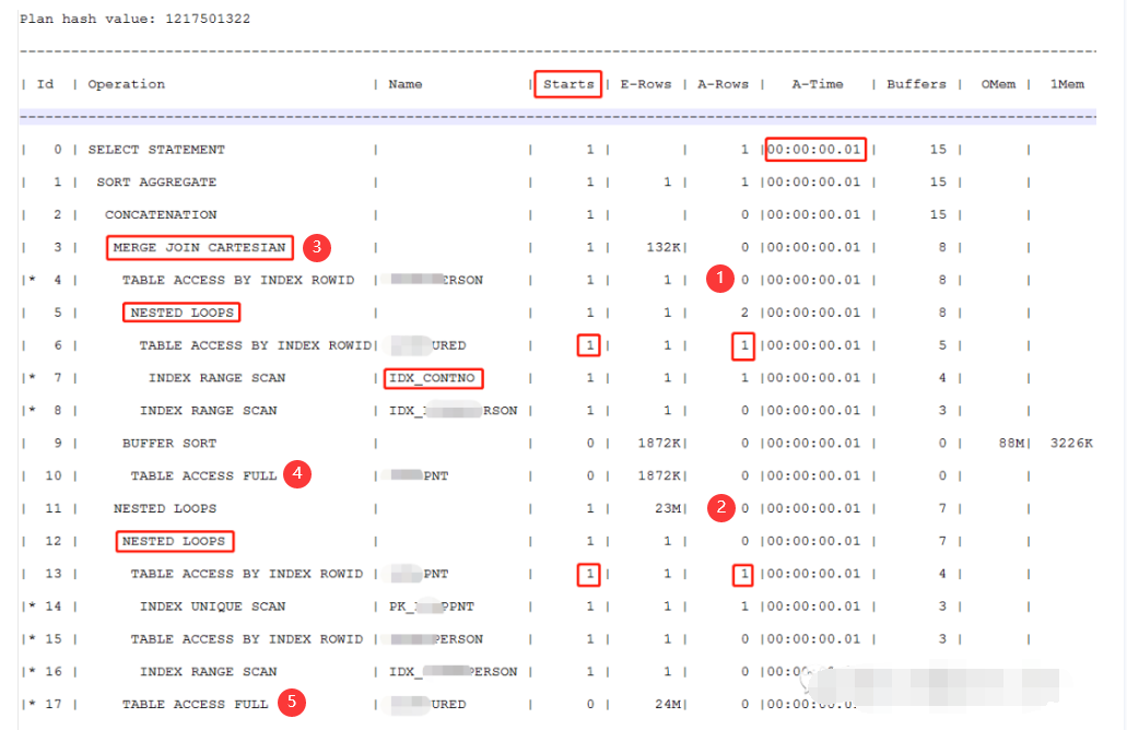 为什么看起来比较差(笛卡尔关联和全表扫描)的执行计划, 执行效率又那么好呢? 这是因为这个SQL使用的一组变量, 返回的结果集为空(最后执行计划我标注1和2的地方), 因为t与m关联后结果集为空, n表的全表扫描不需要了(标注4); t与n关联后结果集为空, m表的全表扫描也不需要了(标注5).