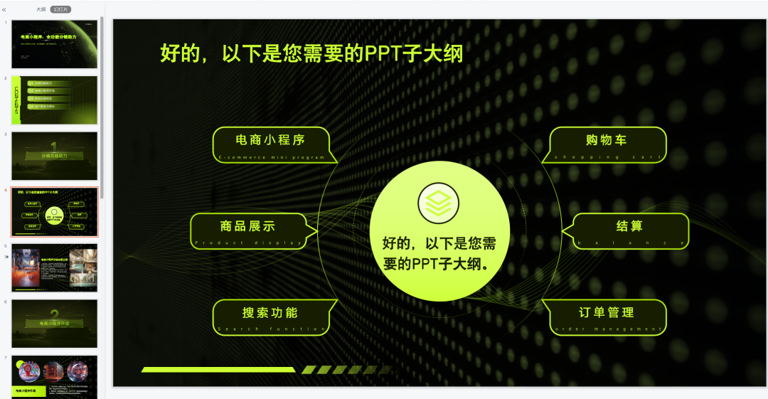 然后不到3秒,就给我生成了一份PPT大纲,核心流程都有了,我自己再加点特别的功能上去。