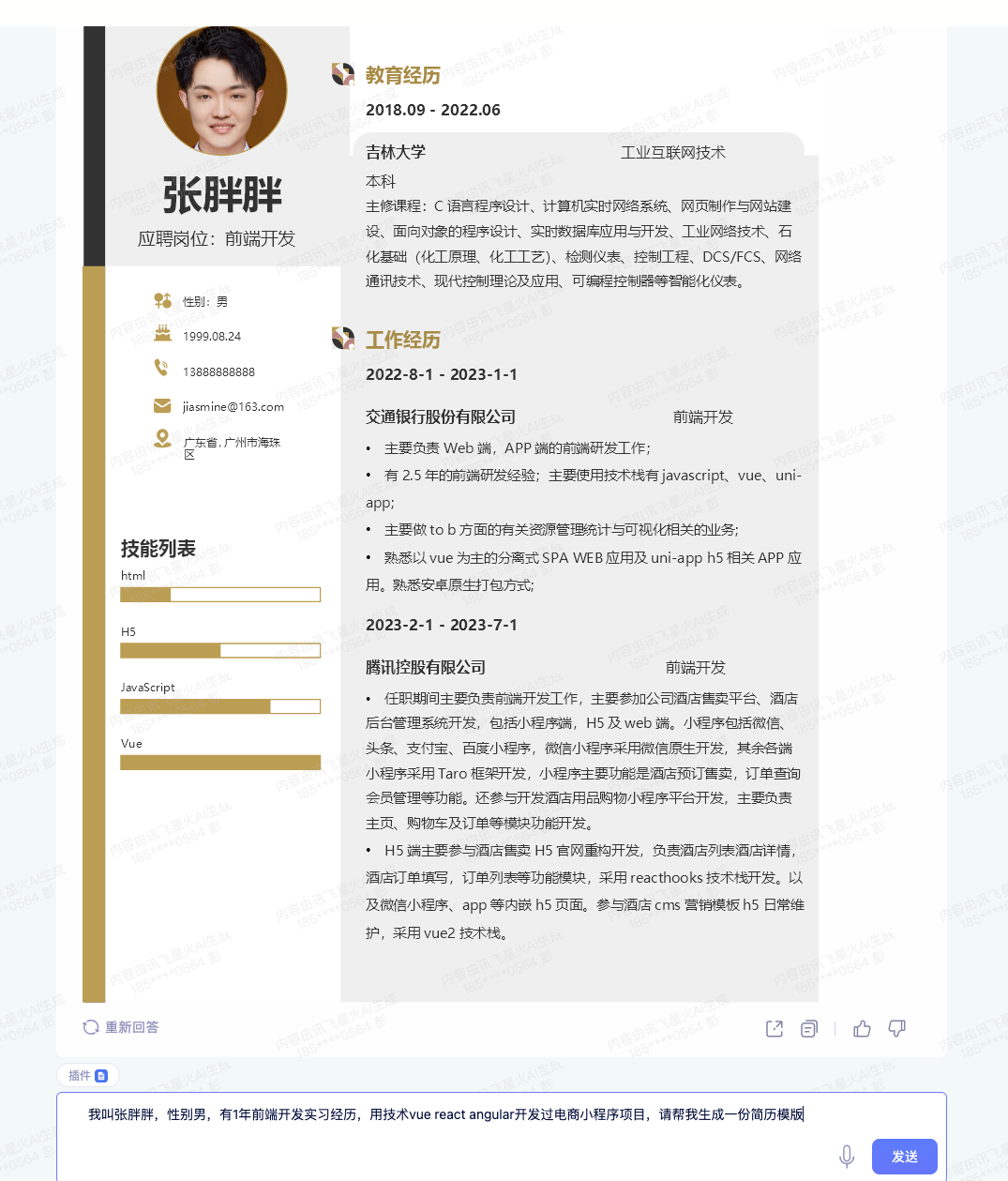 我下面输入信息还是比较简陋 :"我叫张胖胖,性别男,有1年前端开发实习经历,用技术vue react angular开发过电商小程序项目,请帮我生成一份简历模版 。"