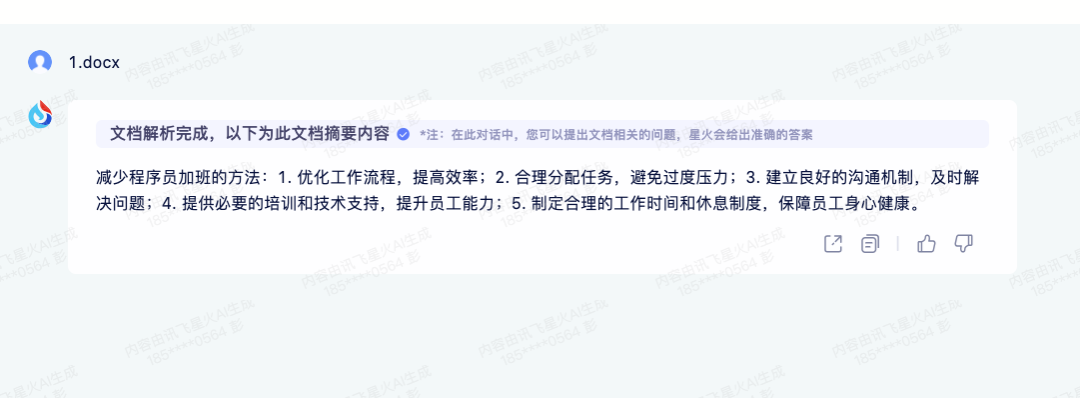 功能,选中后直接弹出一个上传组件,让我上传文档,我上传了一个文档,文档中的内容是我早就写好里的,是:"怎么减少程序员加班?",很让程序员们头疼的一个问题,看看回答,我还是比较满意的。