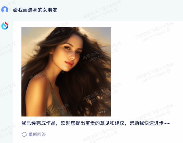 科大讯飞此次上新了多模态功能意味着已经具备了图片生成和图片理解等功能。我赶紧试了一下,我让星火大模型给我生成漂亮女朋友。