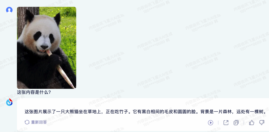星火大模型成功识别出了这是一只大熊猫坐在草地上,正在吃竹子。还添加了一些其余的描述性语句"它有黑白相间的毛皮和圆圆的脸,背景是一片森林,远处有一棵树。"