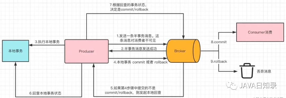 标识,此时该消息就可以被消费者消费了,如果依然入库失败,可以等待再次回查,或者回滚。如果是回滚,则Broker将丢弃该消费,消费者也将无法消费。