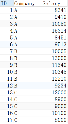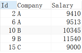 G0809表包含所有员工,其中有三列:员工Id,公司名和薪水。