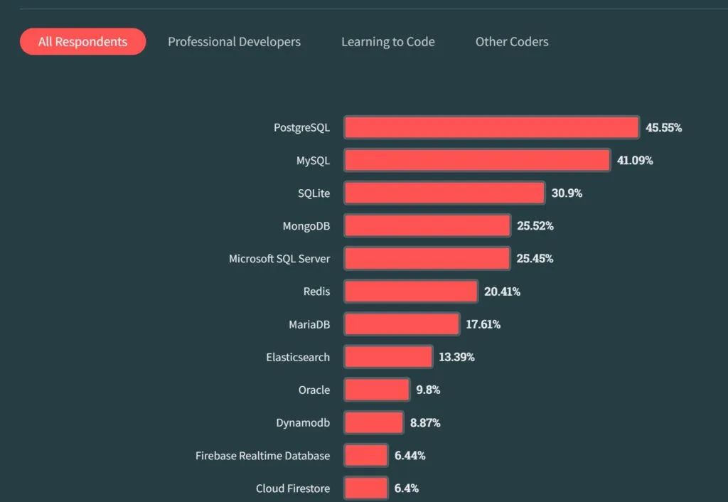 其中,45.55%的受访者使用PostgreSQL,而MySQL和SQLite的比例分别为41.09%和30.9%。而就在三年前,同一项调查显示,MySQL和PostgreSQL的使用率分别为55.6%和36.1%,由此可见,使用PostgreSQL的用户群体的增速有多快。