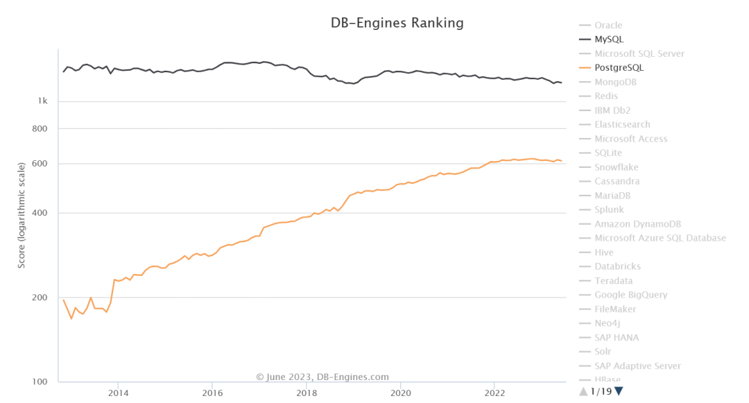 尽管如此,不能否认的事实是,越来越多的开发人员倾向于为他们正在开发的应用程序选择PostgreSQL。而且结合DB-Engines上总结的历年来MySQL和PostgreSQL分数的趋势变化来看,PostgreSQL从2014年开始进入高速增长状态,而MySQL自2016年以来开始缓慢下降。