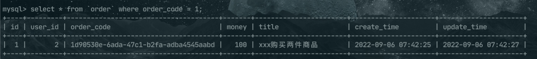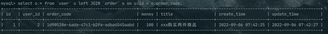 INSERT INTO `order` VALUES (1, 2, '1d90530e-6ada-47c1-b2fa-adba4545aabd', 100, 'xxx购买两件商品', '2022-09-06 07:42:25', '2022-09-06 07:42:27');