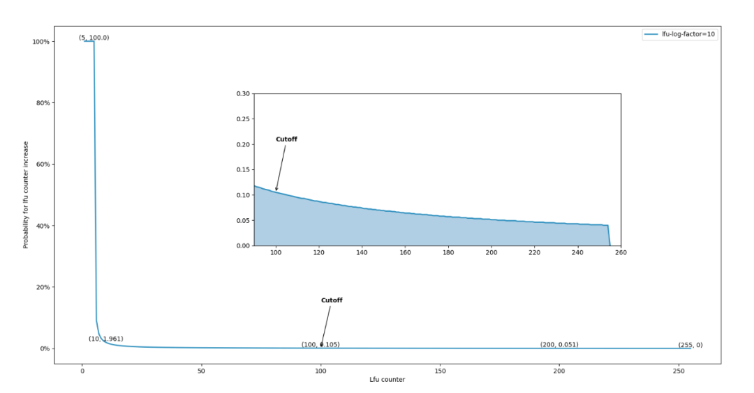 可以清晰的观察到,当LFU counter数值超过LFU_INIT_VAL之后,曲线出现了垂直下降,递增概率陡降到0.2%左右,随后在底部形成一个较为缓慢的衰减曲线,直至counter数值达到255则递增概率归于0,贴合3.3.1章节分析的理论。