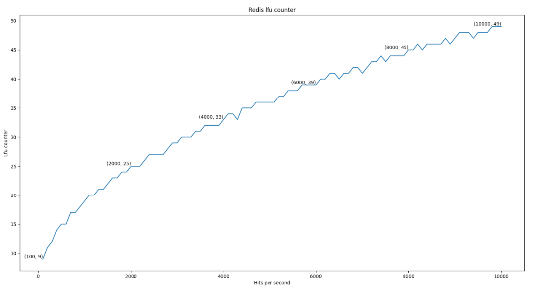 保持Redis系统配置默认值的情况下,对同一个数据持续的访问,并采集此数据的LFU counter数值,绘制出LFU counter数值曲线图: