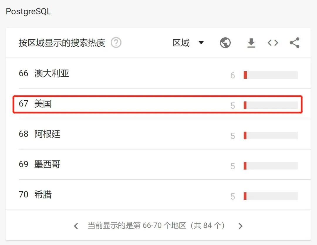 所以,类似 DB-Engines 的统计,不可能完全覆盖所有这些分支版本和云数据库的统计。如果把这些分支版本算上,PG 根本连还手的能力都没有。但 PGer 喜欢拿静态数据看待问题,这就是他们对待事物的认知问题。2、在中国:MySQL 是 PG 的 6-7 倍;3、PG 最为流行的前五个国家分别是中国、韩国、俄罗斯、亚美尼亚、爱沙尼亚。美国仅排第 67 位;上述统计,仅按 MySQL vs PG 计算,没有算上 MySQL 的其他分支版本。而在韩国市场,仅 MariaDB 就可以和 PG 扳一扳手腕了。请问原文作者,凭什么说,MySQL 流行度已被超越?