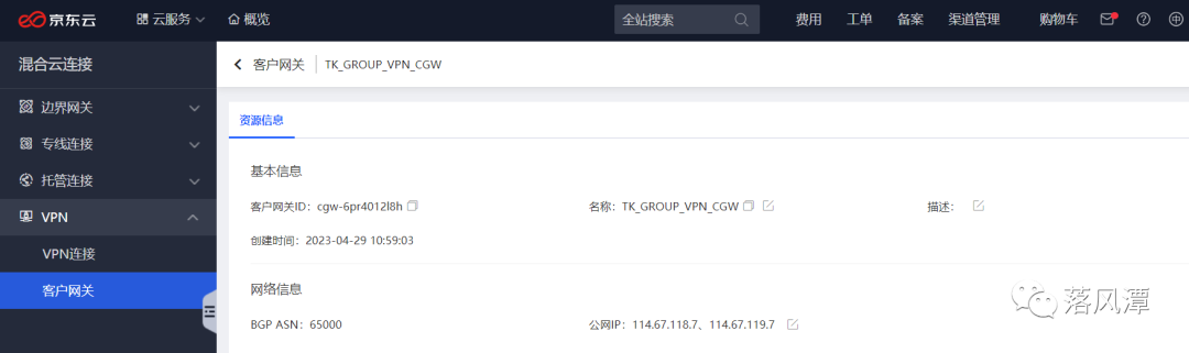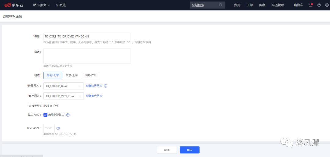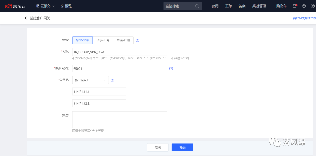 创建VPN客户网关需要指定地域、客户网关名称和BPG ASN,使用默认65001即可,这里的ASN要与之前的BGW边界网关中的ASN不同。