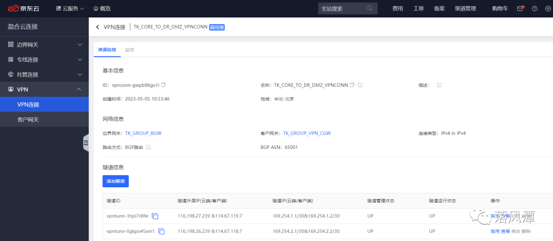 潭主只好在京东云上通过VPN连接实现跨Region的VPC资源互通。