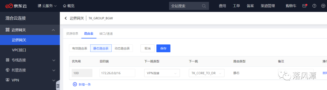 在边界网关的静态路由表中手工添加去往目标VPC的静态路由,目的端为远端VPC对应的网段,下一跳类型为VPN连接,之后选择之前创建的对应VPN连接即可。