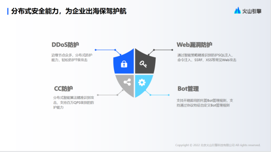 全球加速产品是基于边缘资源来构建的,天然具备一个分布式防护能力,这个节点遭受攻击,其他节点稳定性业务都不会受到任何影响。如果遭受全局攻击,火山引擎全球加速产品具备T级别带宽的DDoS防护能力,以及百万QPS以上级别的CC防护能力,还具备Web漏洞防护以及自定义的Bot管理能力,帮助企业出海进行保驾护航。