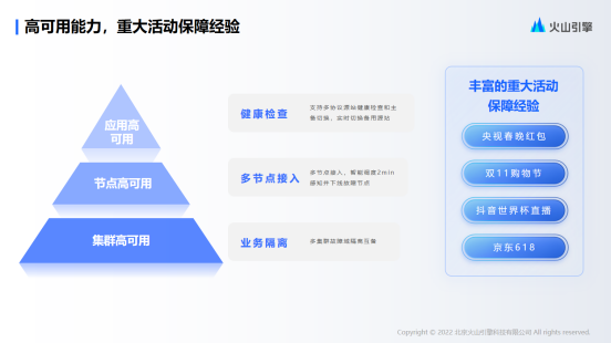 稳定高可用:应用层、节点、集群高可用能力,丰富的活动重保经验。