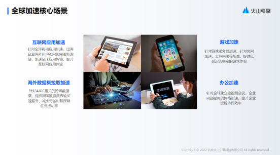 全球加速产品的一些核心应用场景,包含互联网应用加速、游戏加速、海外数据集拉取加速以及办公加速。