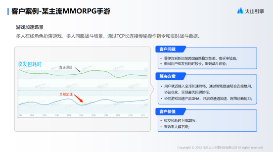 第二个案例是某主流MMORPG游戏,客户主要痛点在于菲律宾玩家到新加坡源站跨国链路距离非常长、时延较大、稳定性较差,玩家体验非常糟糕。火山引擎全球加速产品的解决方案是菲律宾玩家就近接入到火山引擎的菲律宾节点,通过全球加速优质的骨干网络回源新加坡源站,并且开启连接复用能力,针对游戏场景做了传输优化。此外,协同游戏加速产品“GNA”开启双通道加速能力以及网络诊断能力。最终取得收发包耗时下降20%以上,客诉率大幅度下降的收益。