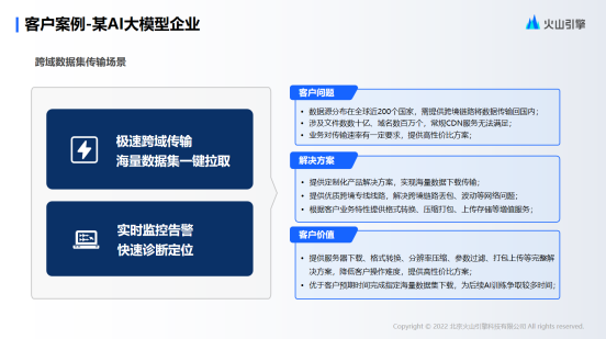 今年AI大模型非常火爆,大模型依赖的海量数据需要从海外传输,这些数据集分布在全球接近200个国家,文件涉及到几十亿,域名达到几百万,全球很多企业也陆续推出了AI大模型,该企业也需要尽快推出自己的大模型,抢占市场。全球加速提供了到日韩、东南亚、香港、欧洲等主要地区的合规跨域专线,加快数据的传输,解决公网时延和带宽不足的问题,第二联动火山引擎对象存储产品,包括MLP云服务产品,从原文件的下载到格式的转换,到分辨率压缩、参数调整,以及打包上传,包括存储、训练,火山引擎提供了一站式服务,帮客户降低了操作难度,并且大幅提前完成了数据集的传输和训练,客户顺利的推出了自己的AI大模型。