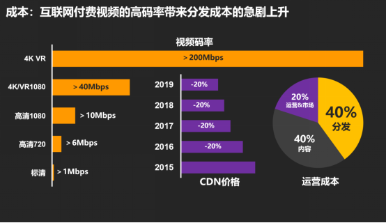 所以,他在当时运营商大力发展CDN的背景下,做出预判:在今后付费视频里,AR/VR或者是4K、8K高清视频,都必须依赖于运营商的CDN和网络基础设施、CDN基础设施来进行付费视频的分发和传播。虽然现在付费视频行业在发展,运营商的CDN也发展很快,但在高清视频上还没有完全达到当时的规划,这是因为整个分发成本还没有完全降下来。