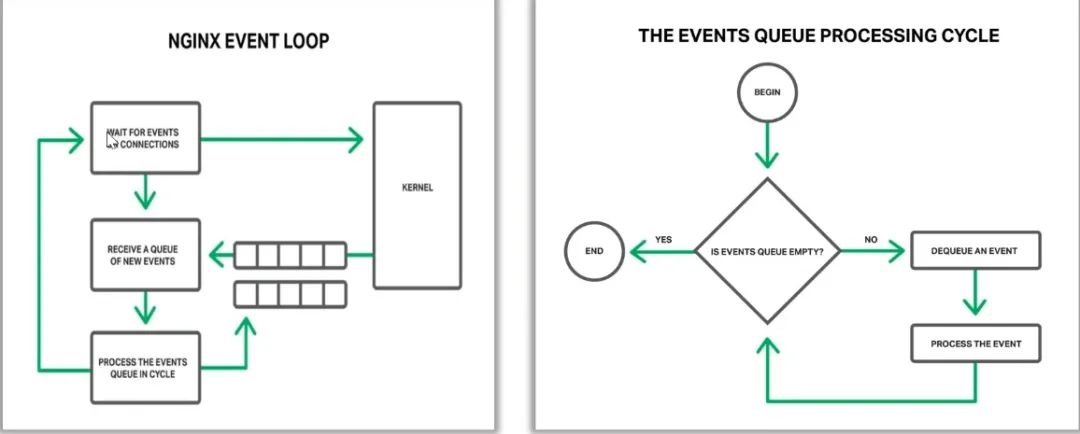 。它开始处理事件的时候上述我们也介绍过了,会有一个转发模块来统一处理,他会向kernel索要相关的事件,kernel会把所有的事件推向消息队列,Nginx会一直消费消息队列中的待处理事件。