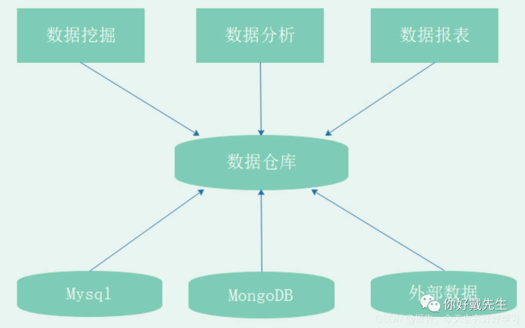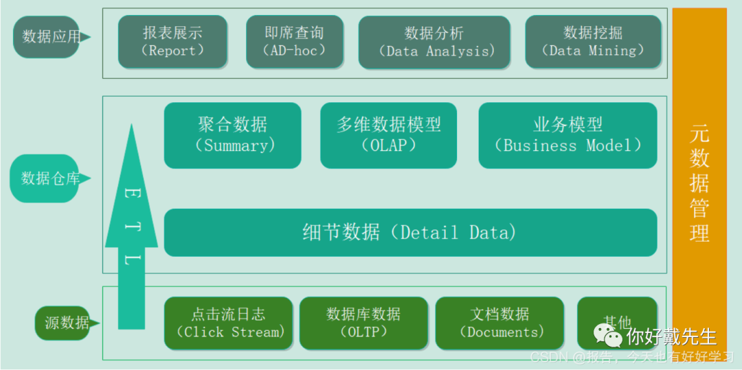 数据仓库系统的数据来源于不同的数据源,例如MySQL、ORACLE和文档等等,而且还提供不同的数据应用。