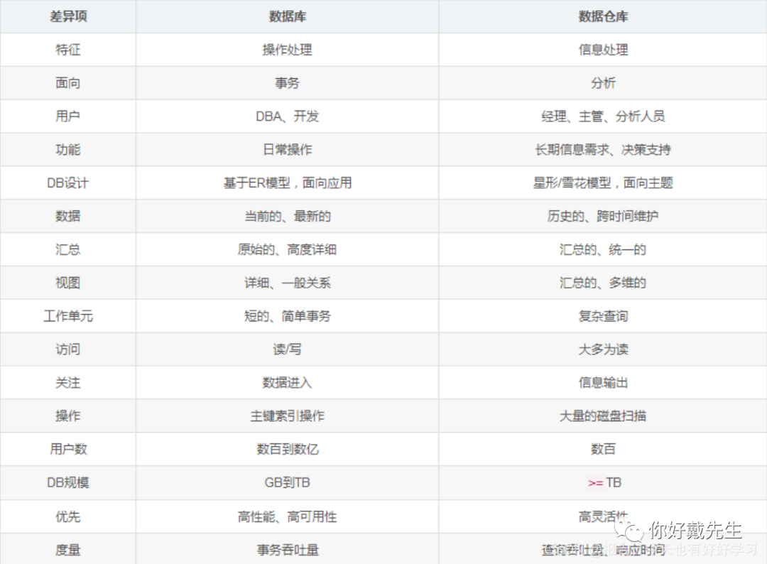 在看具体的差异之前,需要特别提醒的是,数据仓库的出现并不是要取代数据库,它们是各有各的用处的。