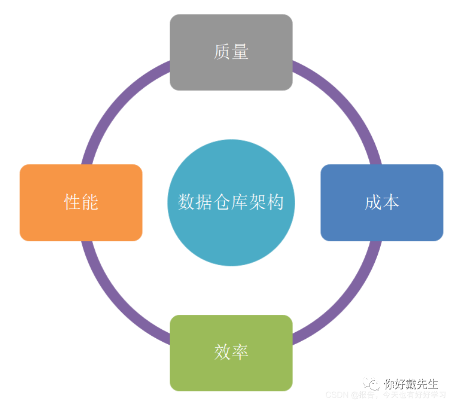我们介绍在数据仓库进行架构的时候,从四个方面进行考量和平衡,如质量、性能、效率、还有成本。