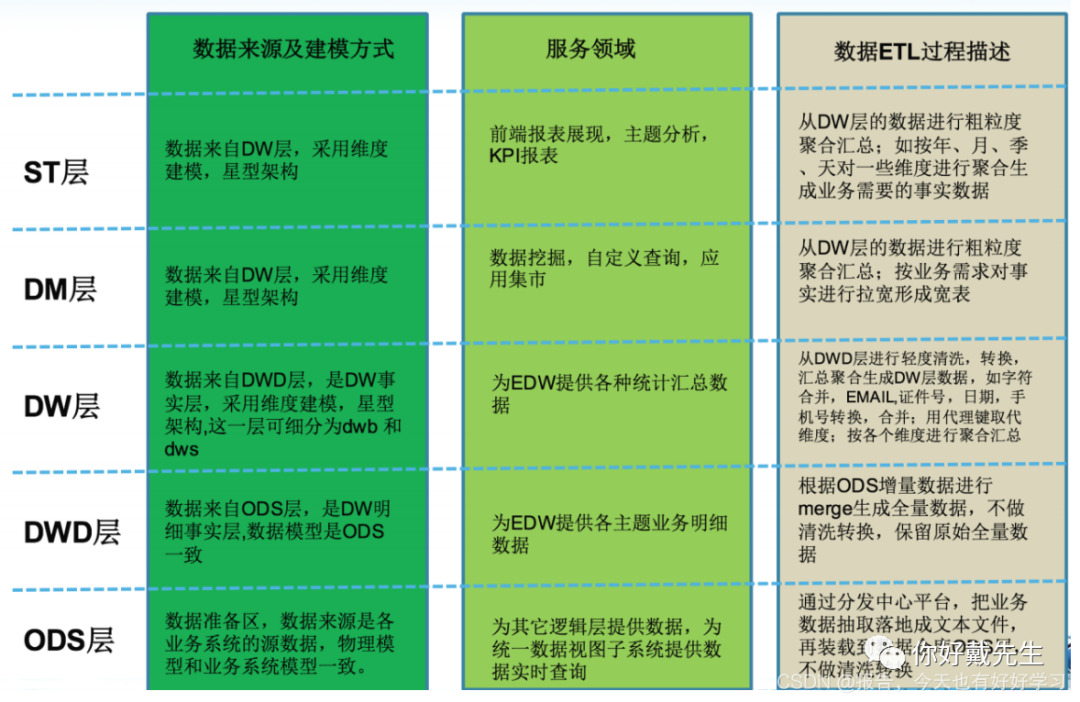 第一层,ODS层,是数据准备区,数据来源是各个业务系统的数据,物理模型和业务系统模型是一致的。