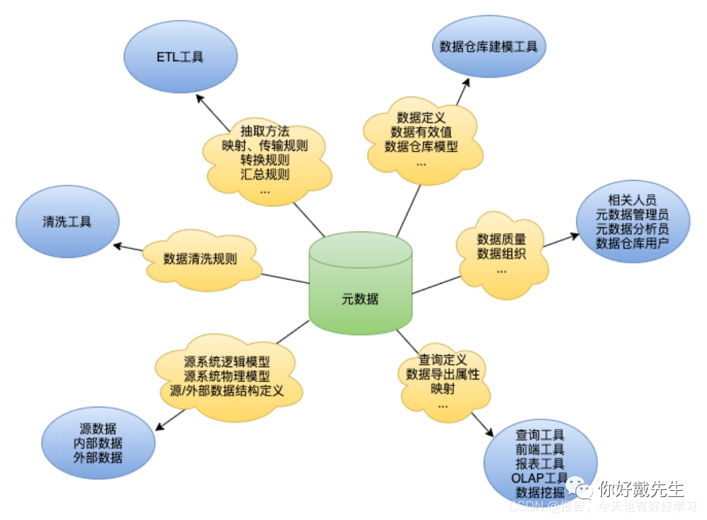 元数据针对于ETL,它存储了抽取方法、映射规则等等。