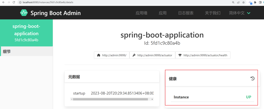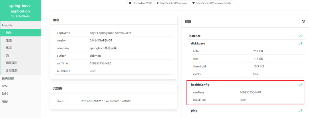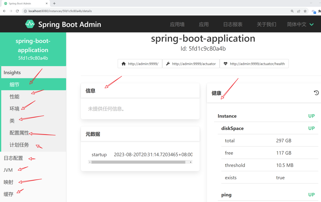 上述配置对于初学者来说比较容易混淆。简单解释一下,到下一节再做具体的讲解。springbootadmin的客户端默认开放了13组信息给服务器,但是这些信息除了一个之外,其他的信息都不让通过HTTP请求查看。所以你看到的信息基本上就没什么内容了,只能看到一个内容,就是下面的健康信息。