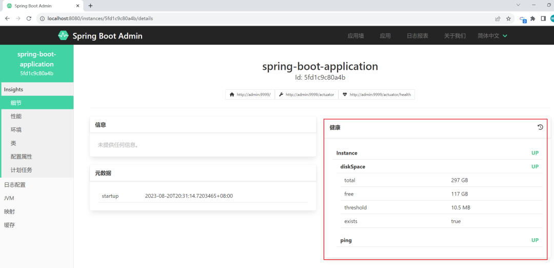 但是即便如此我们看到健康信息中也没什么内容,原因在于健康信息中有一些信息描述了你当前应用使用了什么技术等信息,如果无脑的对外暴露功能会有安全隐患。通过配置就可以开放所有的健康信息明细查看了。