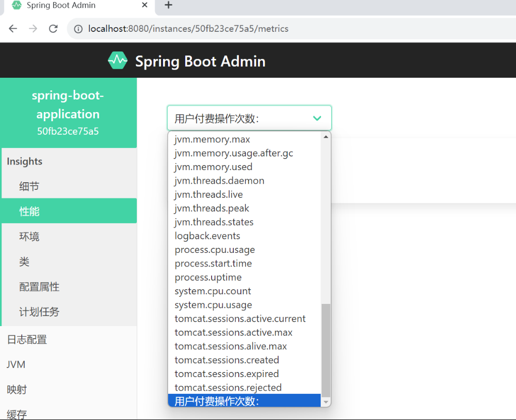 metrics端点描述了性能指标,除了系统自带的监控性能指标,还可以自定义性能指标。