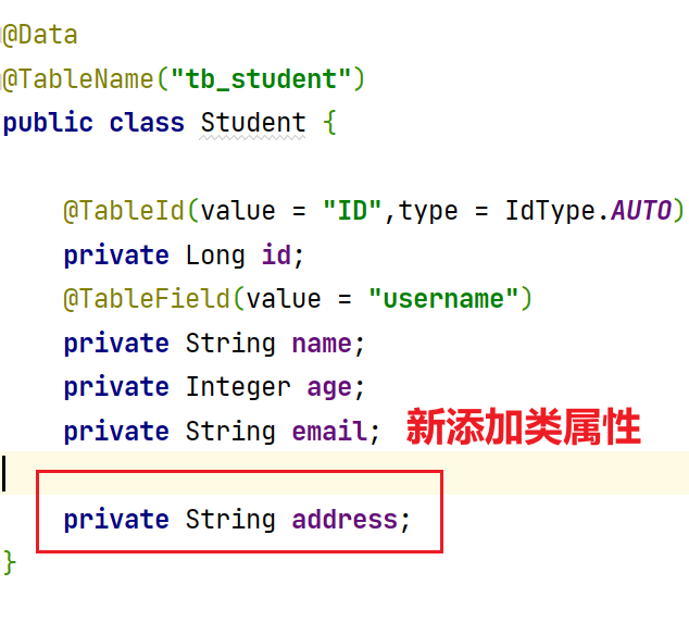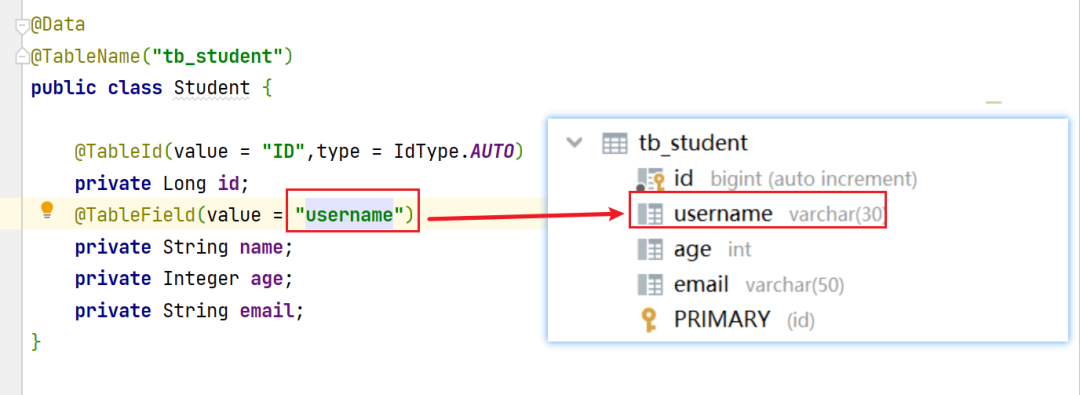 在模型类属性上方,使用 @TableField属性注解,通过value属性,设置当前属性对应的数据库表中的字段关系。
