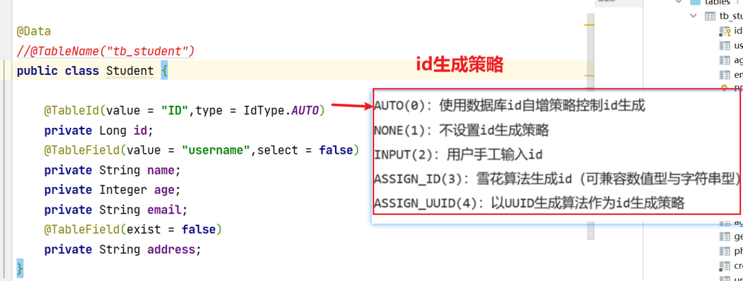 思考:这两种使用哪些场景?如果大部分表都有相同前缀,则可以使用方法2解决,否则使用方法一Student类完整代码: