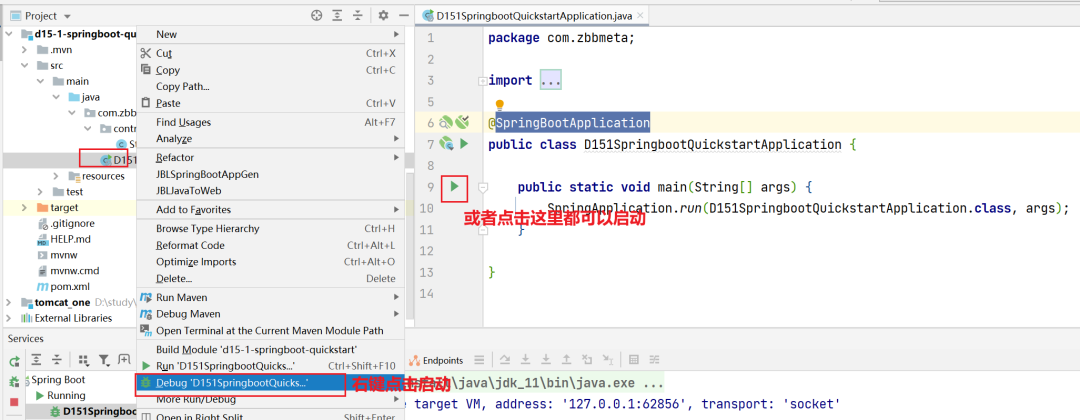 SpringApplication.run(D151SpringbootQuickstartApplication.class, args);