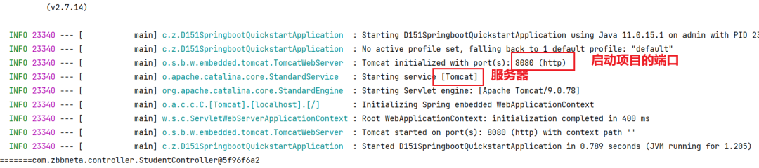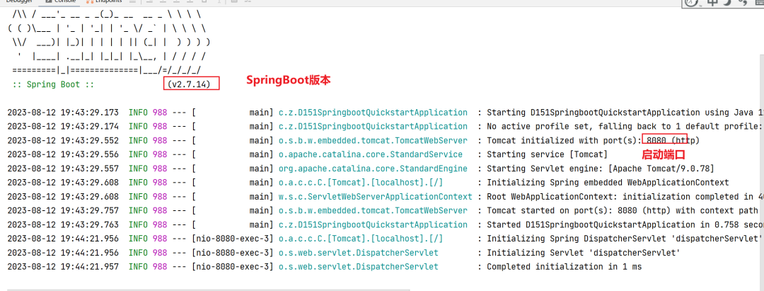 当我们运行SpringBoot的引导类时(运行main方法),就会看到命令行输出的日志,其中占用8080端口的就是Tomcat。