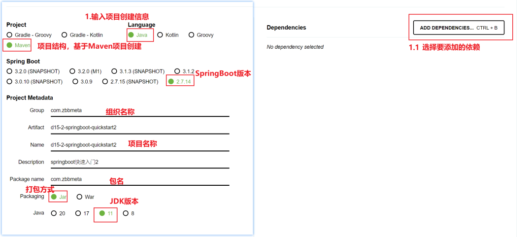 右侧的ADD DEPENDENCIES用于选择使用何种技术,和之前勾选的Spring WEB是在做同一件事,仅仅是界面不同而已,点击后打开网页版的技术选择界面