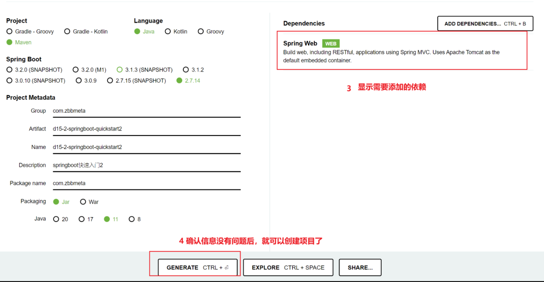基本信息描述完毕之后,勾选web开发相关依赖。