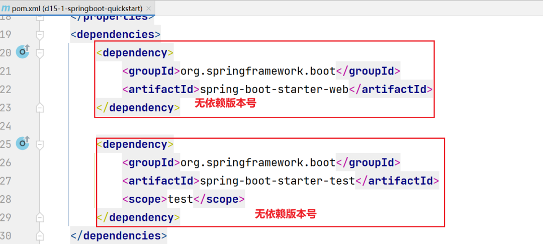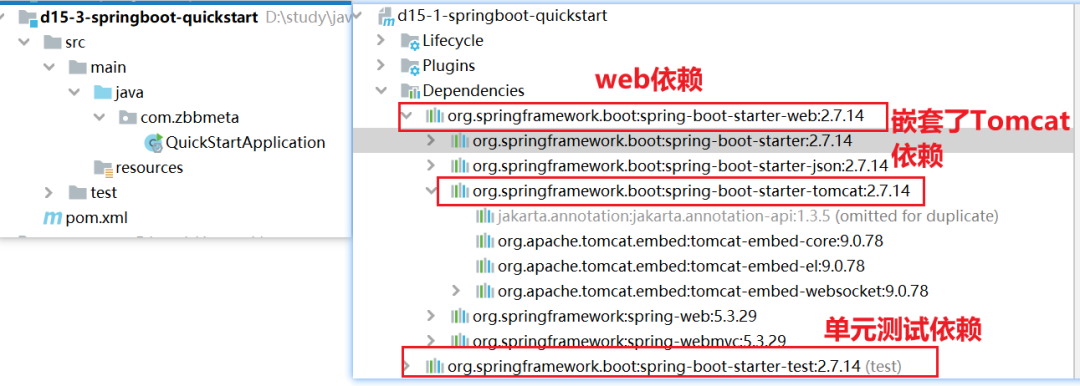 在我们之前讲解的SpringBoot快速入门案例中,同样也引用了:web依赖和test依赖
