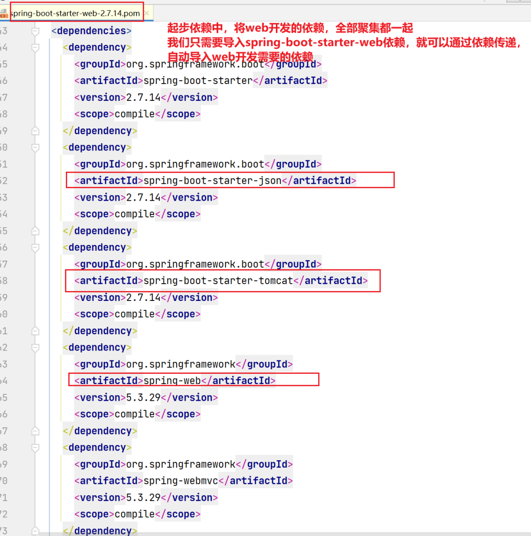 起步依赖有什么特殊之处呢,这里我们以入门案例中引入的起步依赖做为讲解: