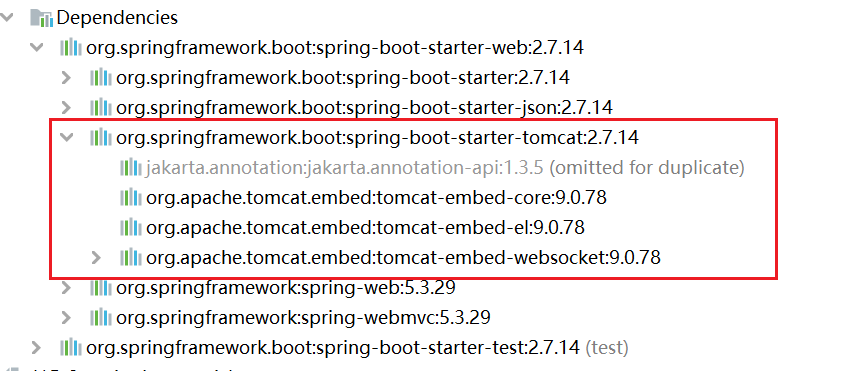 我们可以通过IDEA开发工具右侧的maven面板中,就可以看到当前工程引入的依赖。其中已经将Tomcat的相关依赖传递下来了,也就是说在SpringBoot中可以直接使用Tomcat服务器。