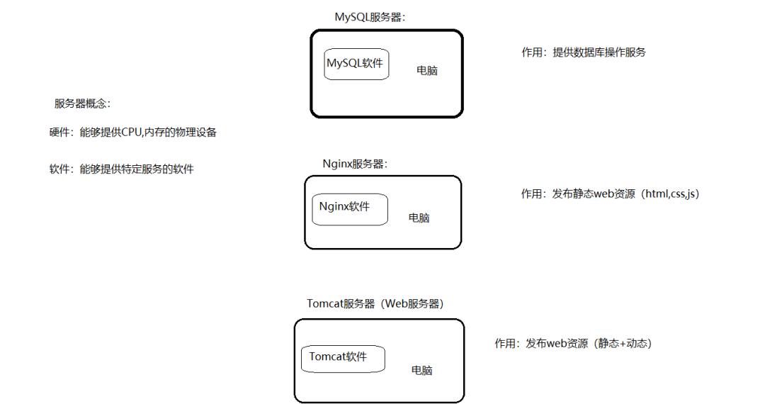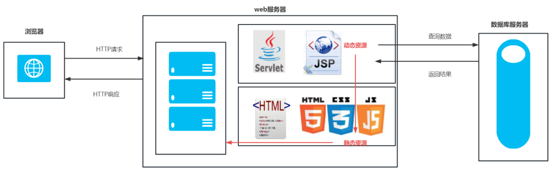 静态资源:HTML、CSS、JavaScript、图片等。负责页面展现,资源是一成不变的,运行在浏览器 动态资源:Servlet、JSP 等。负责逻辑处理,资源是变化的,运行在服务器。 数据库:负责存储数据 HTTP协议:定义通信规则