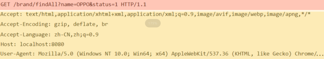 连接请求方式:GET 资源路径:/brand/findAll?name=OPPO&status=1 协议/版本:HTTP/1.1 请求头 :第二行开始,上图黄色部分内容就是请求头。格式为key: value形式