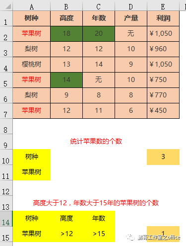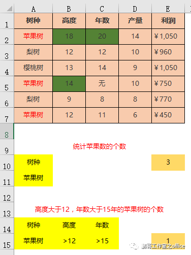 统计高度大于12,年数大于15的苹果数的个数,有一条记录符合要求,但我们是对D列符合条件的数值单元格进行计数,因为符合条件的记录D列对应的不是数值,所以返回0。