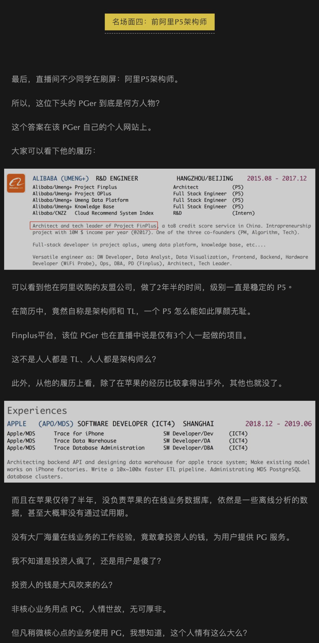 在阿里期间,我曾在友盟 FinPlus 担任Tech Leader,和另外一位产品经理与算法工程师一起搞起了这个内部创业项目,从 16 年到现在每年1个亿营收,是友盟营收的扛把子。就是在这个项目里,我选型了 PostgreSQL + Go,从阿里这个 Java 与 MySQL 的大本营中独自杀出了一条血路。我本科毕业3年时间拿下苹果 ICT4 = P8+,7年时间拿投资自己出来创业当CEO。姜想用P5架构师这个来羞辱我,我就当它在给我打广告了。