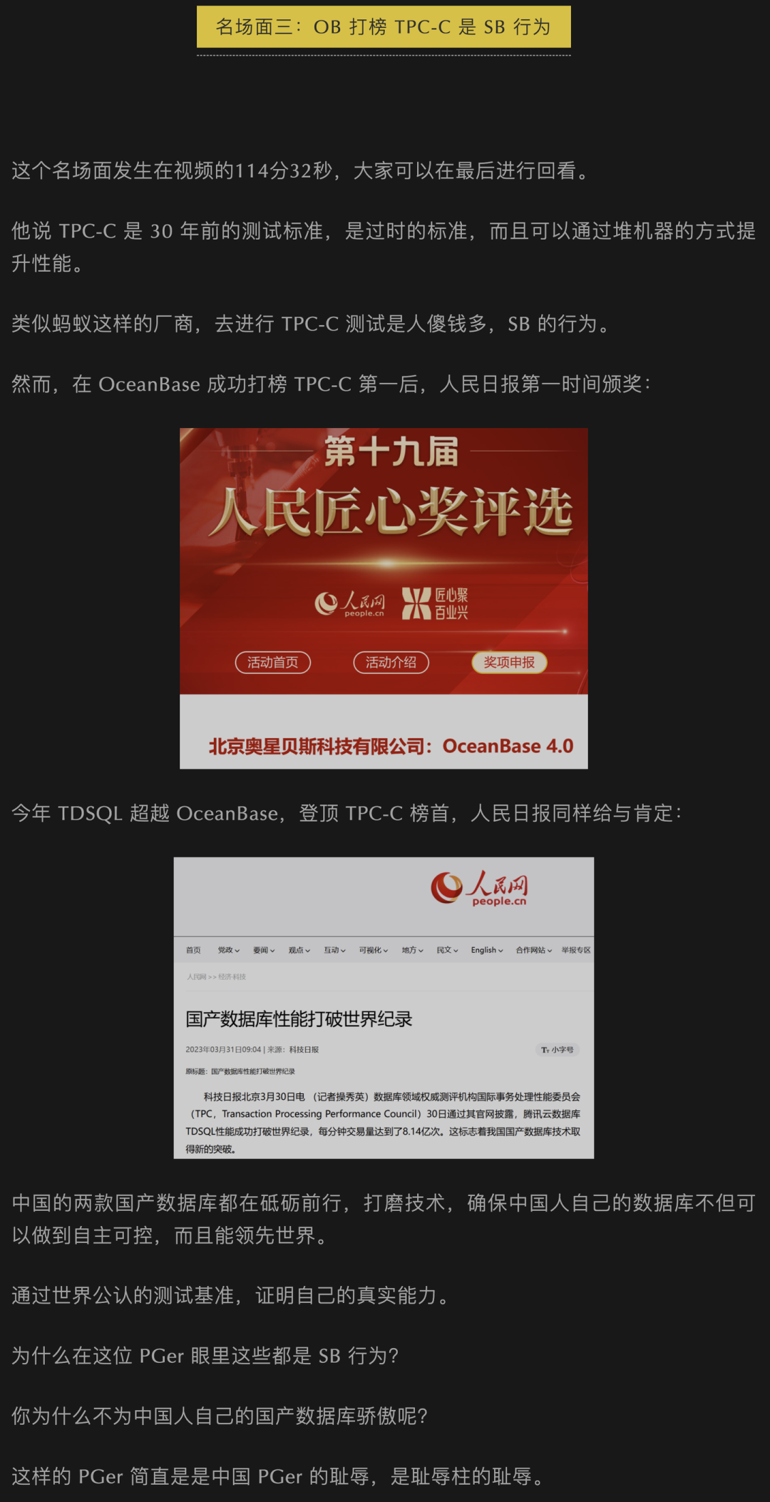 我确实认为打榜是一种 SB (sysbench)行为。TPC-C 已经是30年前的老东西了,没有办法有效反映当下数据库性能,技术参考价值还不如 sysbench:这是一个可以靠堆机器来近乎无限刷高数字的评测,在 OB 打榜前已经有快10年没人来玩了。OB 和 TDSQL 这两个数据库花了几个亿放了个大炮仗,给国外评测委员会滋滋送钱,放卫星吹亩产万斤的牛逼,请问这不是 SB 行为是什么?