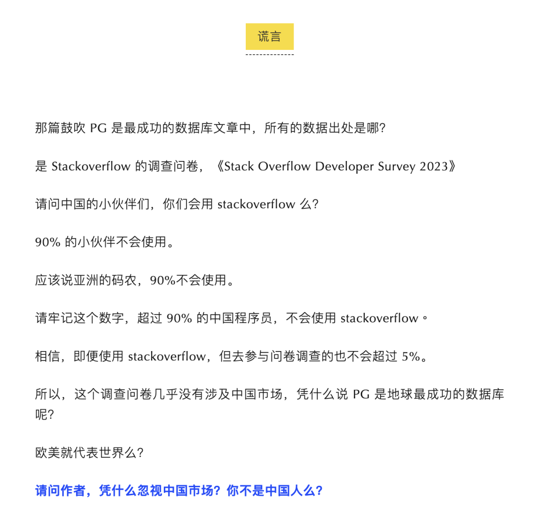 作者又提出,StackOverflow 答问卷的大概率都是菜鸟。我相信他一定没有完整阅读 StackOverflow 2023 开发者调研的完整报告,否则不会出现这种基础的事实性错误。
