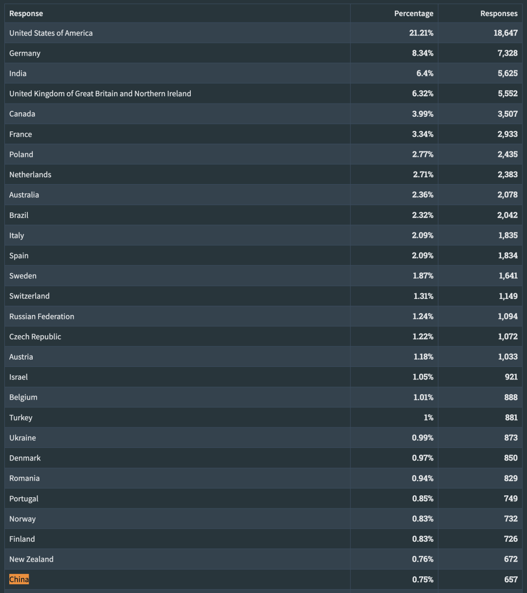 诚然,中国用户由于众所周知的原因,在国际社区参与度偏低。例如,StackOverflow 2023 调研的用户画像中,中国开发者仅占总数的 0.75%,排名第 28 ,显然与一个“开发者大国”的身份不相符。
