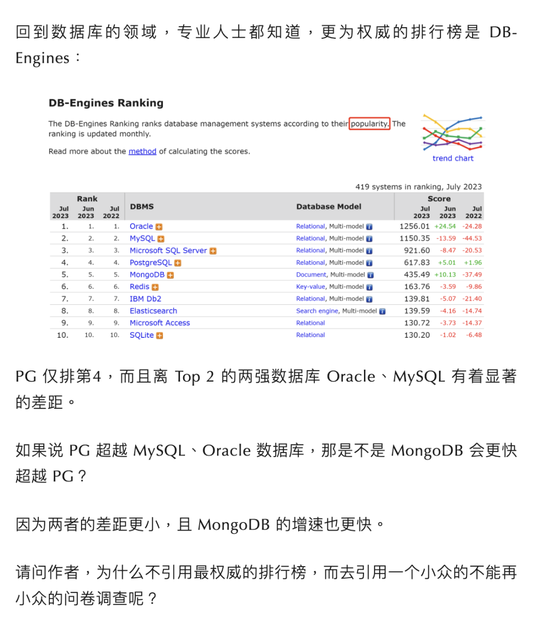 在文章的第一部分,作者又对 StackOverflow 问卷调研的可信度提出质疑,理由是有一个 “更为权威” 的数据库排行榜:DB-Engine 。而在 DB-Engine 排行榜上, MySQL (2nd)比 PostgreSQL(4th) 更高。