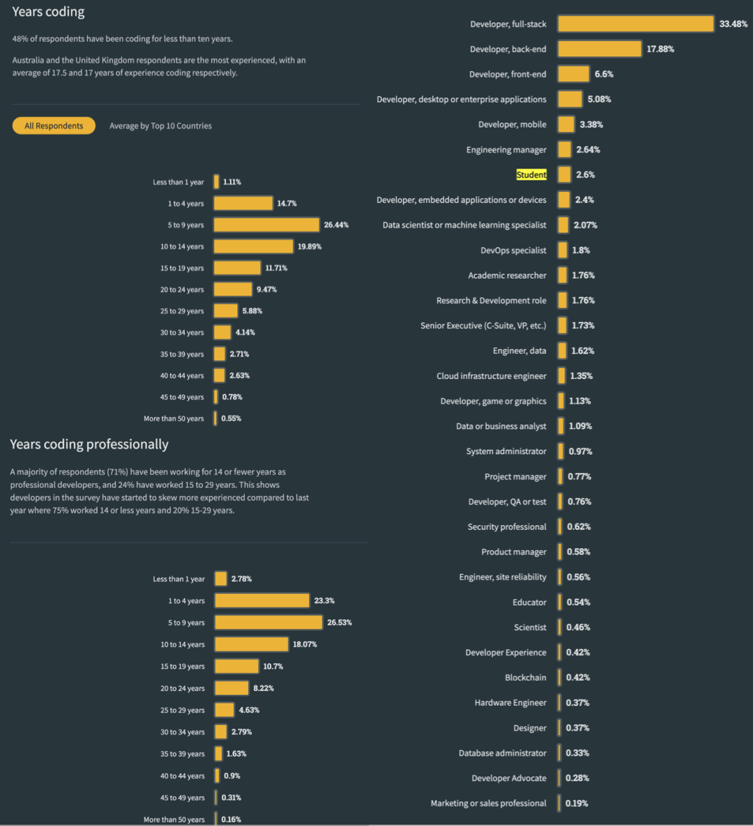 StackOverflow 在 Developer Profile 中完整给出了参与调查人口的画像。其中概率最大的用户群体是具有 5-9 年(专业)编程经验的开发者,国内大致属 P7 层次,怎么也称不上是刚入门的初级码农与学生。事实上本次调研中无论是学生,还是初学码农的比例都是清楚给出的:学生的比例只有 2.6% ,而初学者的比例为 5.6% ,无论如何也称不上是 “大概率”。